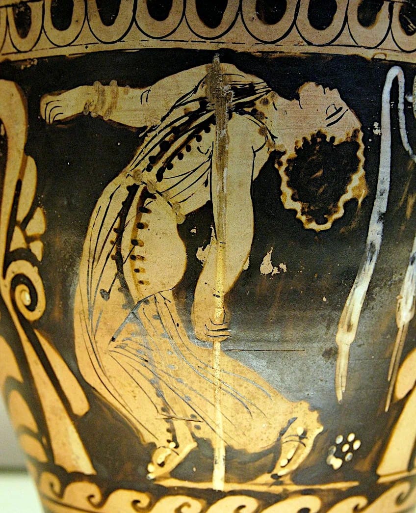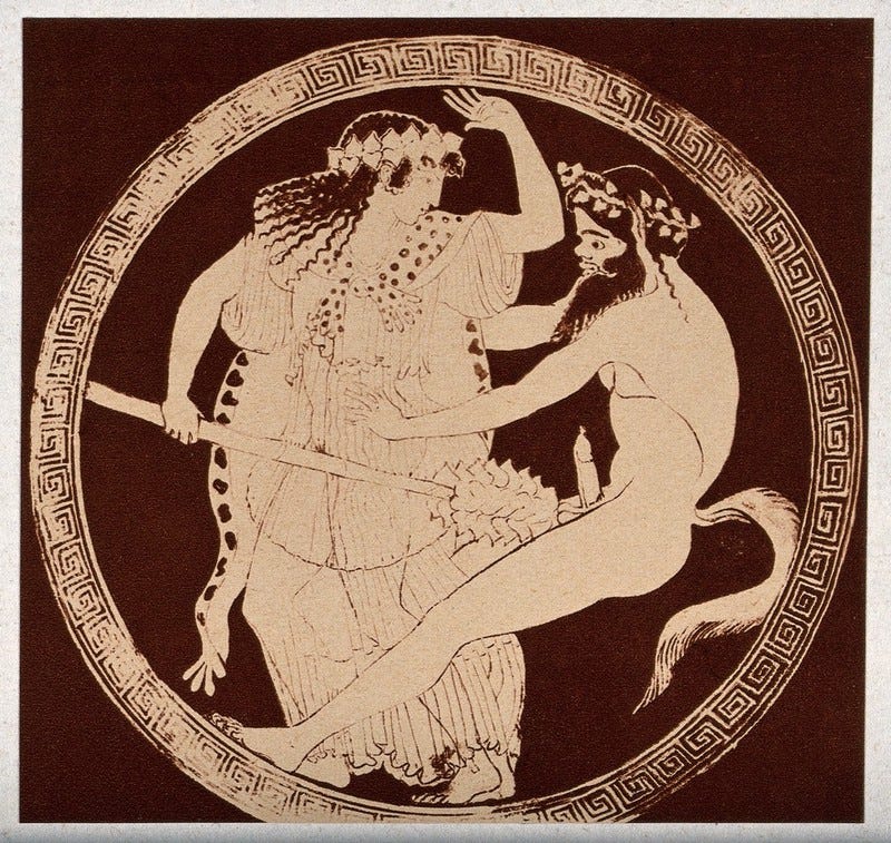 Oh, those maenads, devotees of Dionysus, the god of ecstasy and madness - brilliant pharmakia of the ancient world. Pharmakia, by the way, started out meaning expert at mixing drugs (it’s the root of our word pharmacy) and ended up meaning terrifying witch who should be burned at the stake.